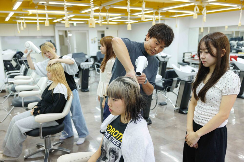 今回の撮影はカラーヘアを美しく見せるというテーマがあるため、通常のスタイリングよりもブローの仕上がりが、撮影を左右するといっても過言ではありません。入学してまだ3~4か月しか経っていない中で、美容学校でも後期に履修するブローのレッスン。もちろん学生たちは今回が初めて。ヴェールルージュの教員、アジュバン社員で一から伝えていきます。「これ当日本当にできるのかな?」「モデルさんの頭でするのが緊張する」など、ブローの難しさに挑みつつも、さすがは学生。素直に技術を吸収し、少しずつコツを掴んでいきます。