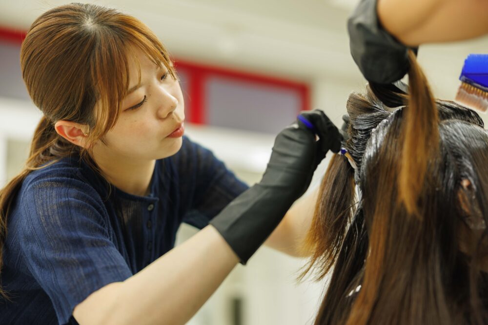 モデルさんへのカラー施術は、アジュバン本社スタジオで社員が行いました。
