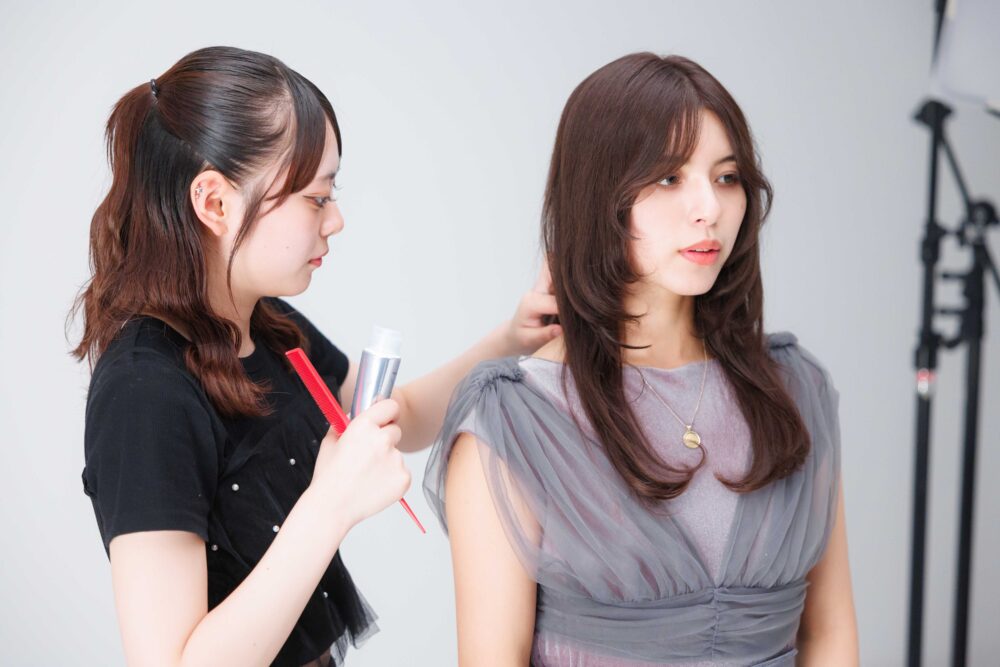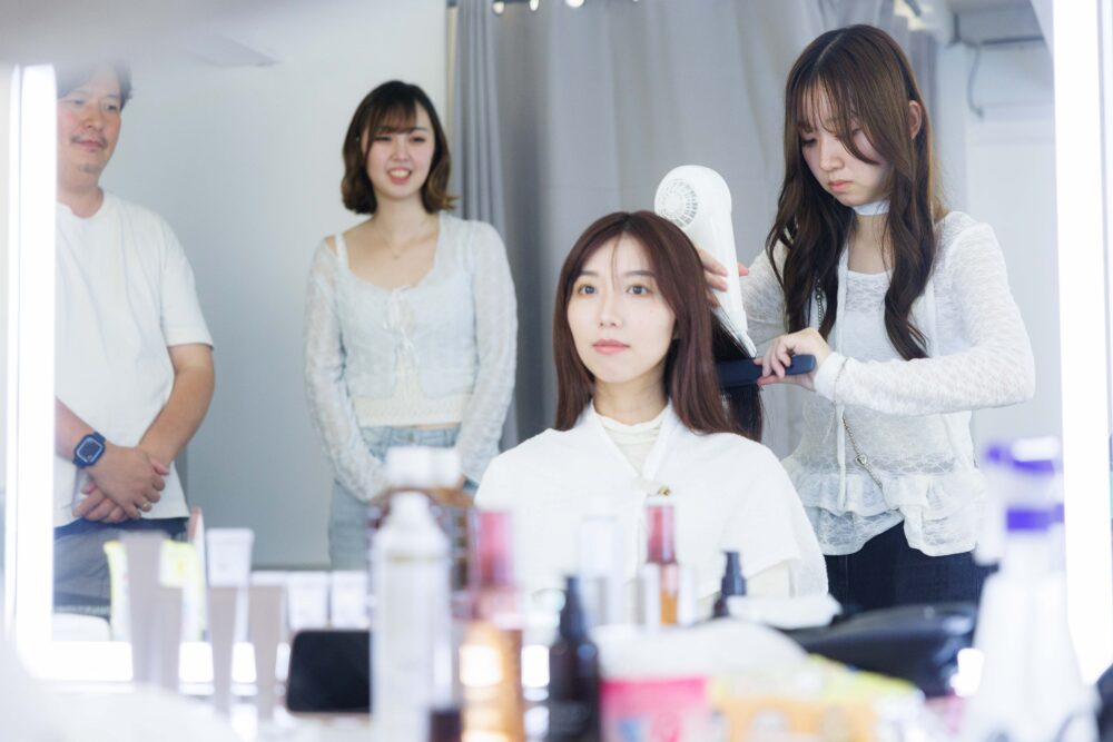 2025年8月、プロジェクト参加希望者として集まった学生は6名。前回とは異なり、技術レッスンも行うことを踏まえ今回は夏休み期間にもかかわらず、30名以上という応募者の中から6名3チームの体制まで絞らせていただきました。こちらが用意するモデルは3名、今年6月に発売されたヘアカラー剤「LOOP SHEERD.COLOR」で髪色をそれぞれの印象に合わせて施術した後、学生にヘアメイク撮影に挑んでもらいます。