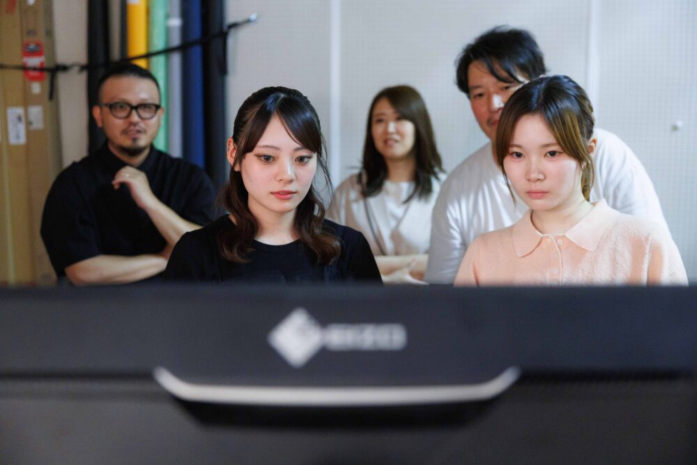 学生たちはカメラマンの後ろに待機して、撮影された画像をアジュバンの社員と一緒にチェック。気になる部分がある場合はプロにアドバイスをいただきながら、手直しのためにモデルのもとへ駆け寄ります。