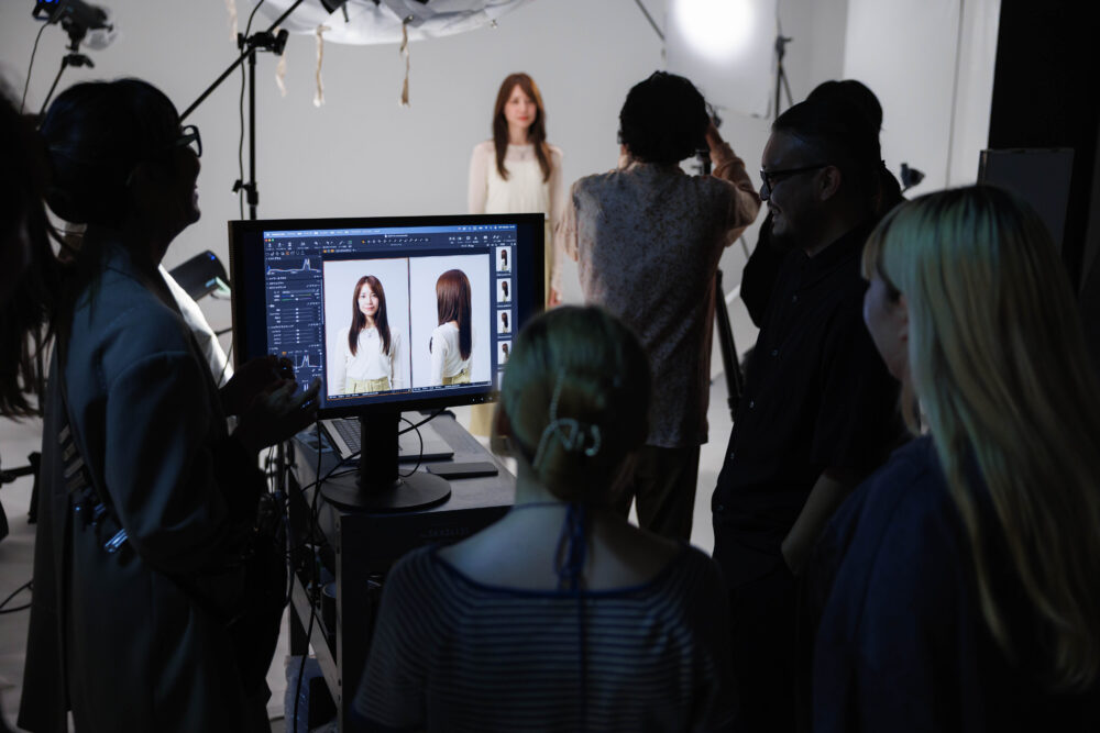 撮影モデル人数は少ないものの、より濃度の高い時間になったかと思います。レンズを通しての見え方、髪の流れやメイクの入り具合など、学生たちはプロのヘアメイクさん、カメラマンからの指示をうけながら奮闘していました。