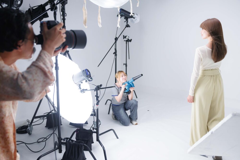 撮影は大阪のスタジオで行いました。現場にはプロカメラマンに、スタイルチェックや衣装チェックをするプロのヘアメイクさんも集合しています。学生たちも香盤表に合わせてスタジオ入り。いよいよプロジェクト集大成です。